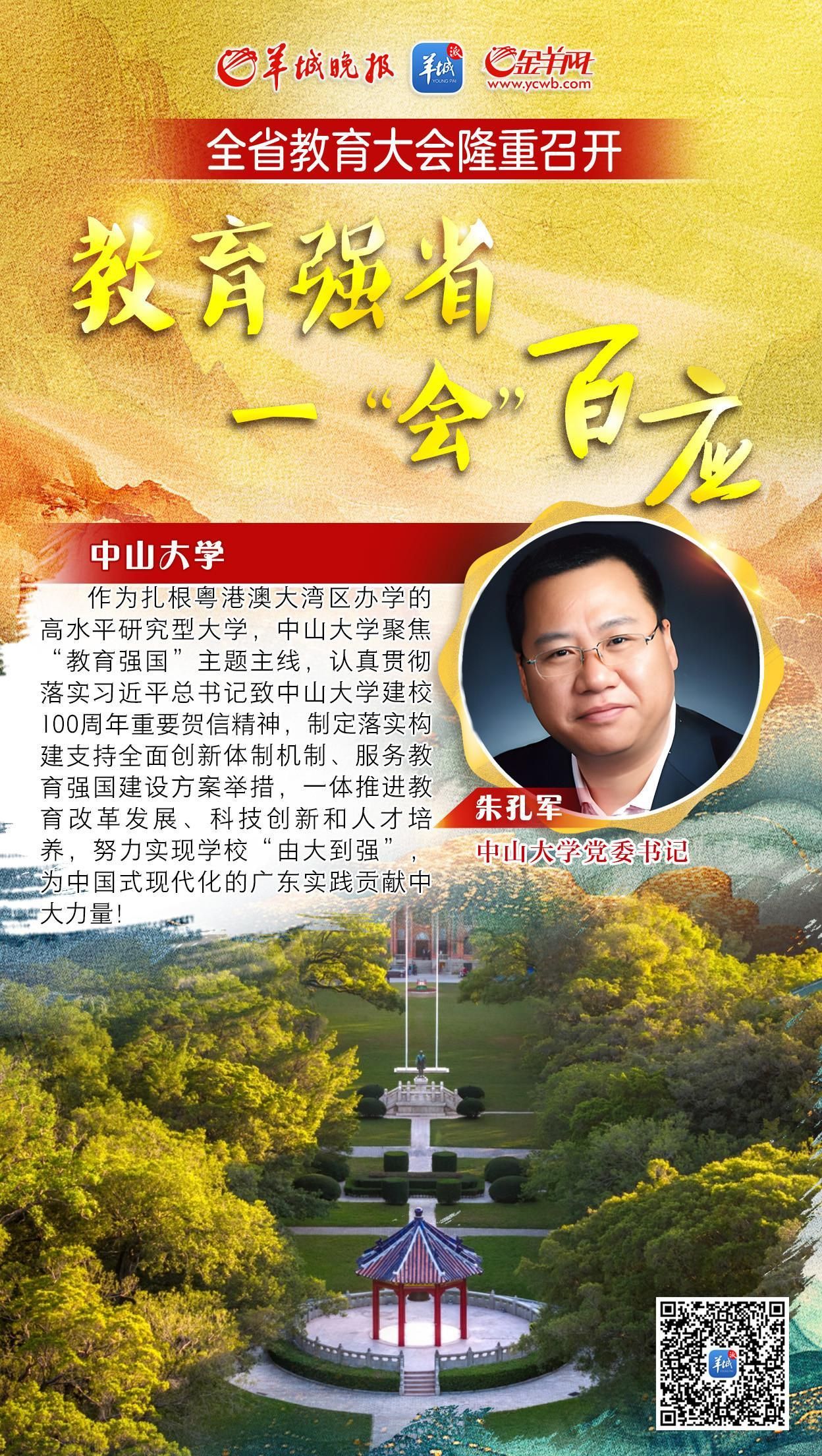 2月24日,广东省教育大会在广州召开,中山大学党委书记朱孔军作会议发言时表示,中大将牢牢把握教育的政治属性、人民属性、战略属性一体推进教育改革发展科技创新和人才培养加快建设中国特色世界一流大学。